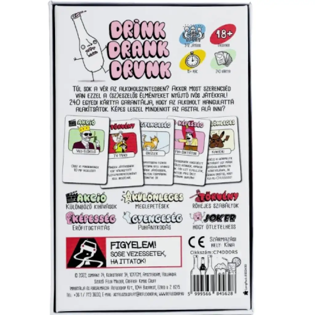 Drink Drank Drunk je zabavna družabna pivska kartaška igra, v kateri moraš s pomočjo norih kart prisiliti svoje soigralce, da pijejo. V kompletu je skupno šest različnih vrst kart, vsaka z edinstvenimi lastnostmi: Akcija, Posebna, Sposobnost, Zakon, Slabost in Joker karte. Poglejmo, kdo bo najbolj spreten in kdo bo največkrat prisilil soigralce k pitju. Igro lahko igra 3 do 12 ljudi naenkrat, en krog pa traja približno 15 minut.