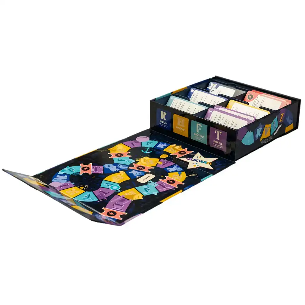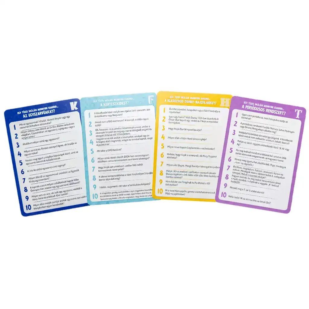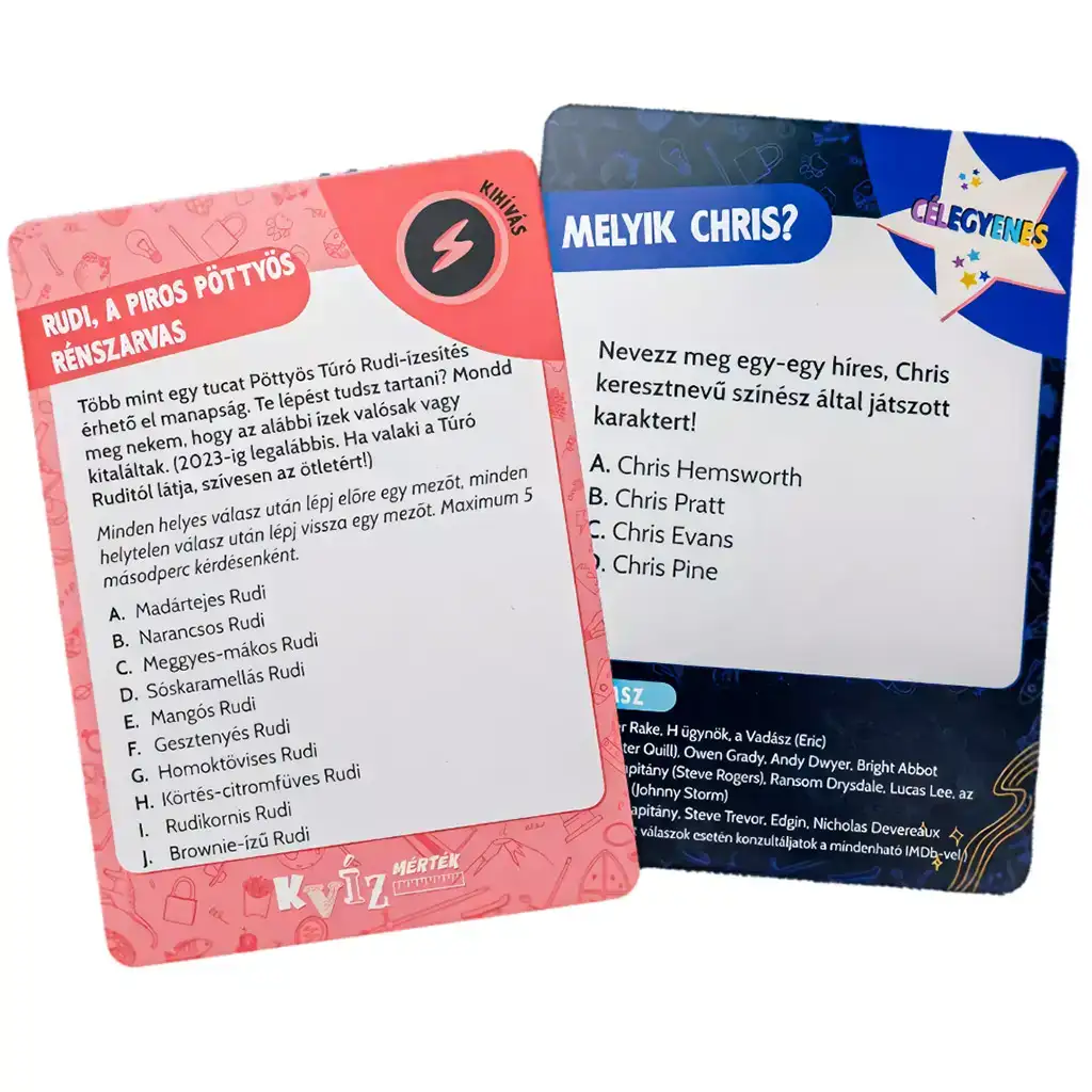 Družabna igra Kvízmérték je resnično posebna kvizna igra, ki ne preizkuša le zgolj znanja, temveč tudi pripravljenost ekip na tveganje. Kako dobro poznate različna področja? Čutite se dovolj pogumne, da izberete najtežja vprašanja in tako osvojite največ točk? Ali pa raje igrate na varno? V tej igri sami odločate, koliko samozavestni ste na določenem področju – najtežja vprašanja vas čakajo na vrhu lestvice od 1 do 10!