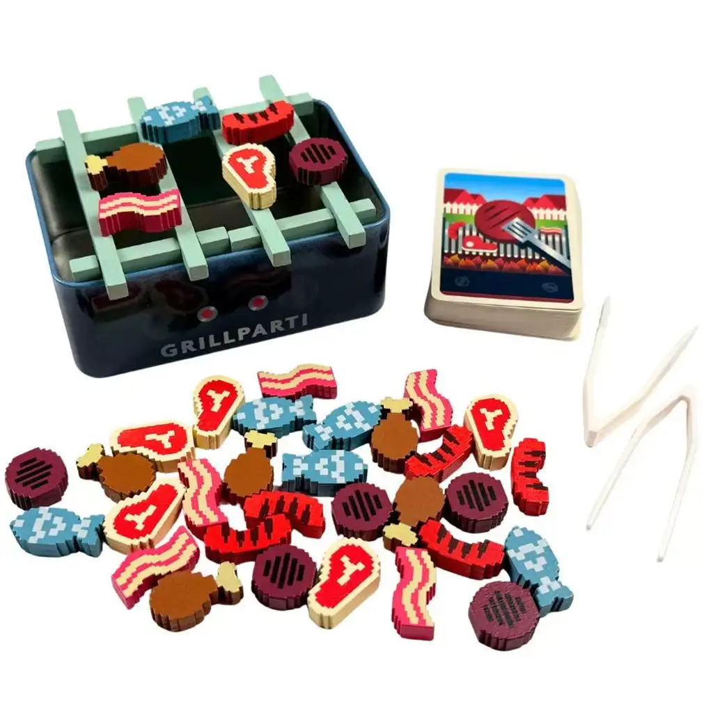 Škatla vsebuje veliko natančno izdelanih lesenih koščkov hrane: zrezki, slanina, riba, klobasa in piščančje bedro – vse v retro, pixel-art slogu. Mehanika igre je zelo hitra, ena partija traja le 3 do 15 minut, zato je odlična izbira za krajše igralne večere ali za na potovanje. Kompaktna kovinska škatla je vzdržljiva in preprosta za prenašanje, zato je igra vedno pri roki, kadar vas zamika žar zabava.