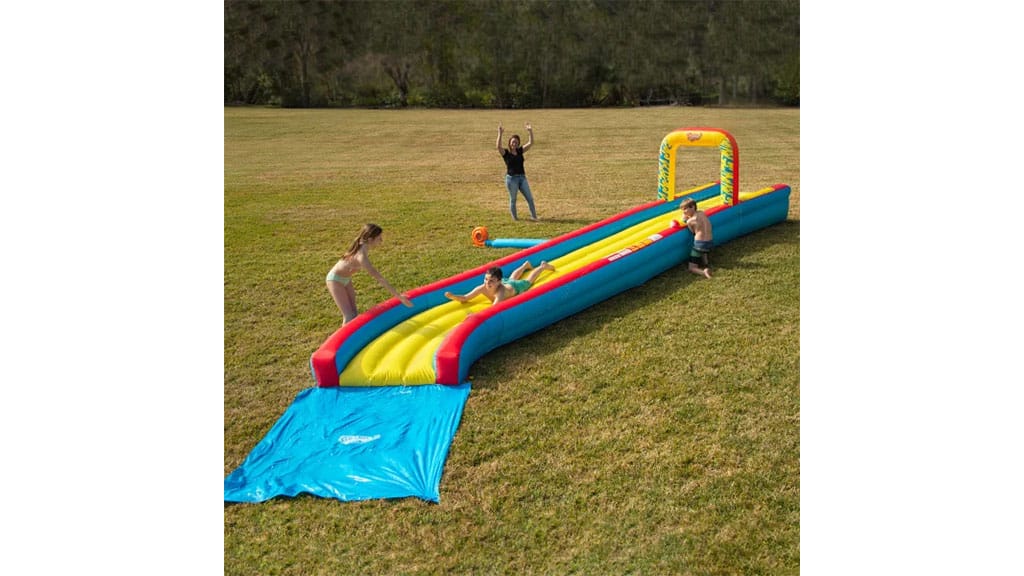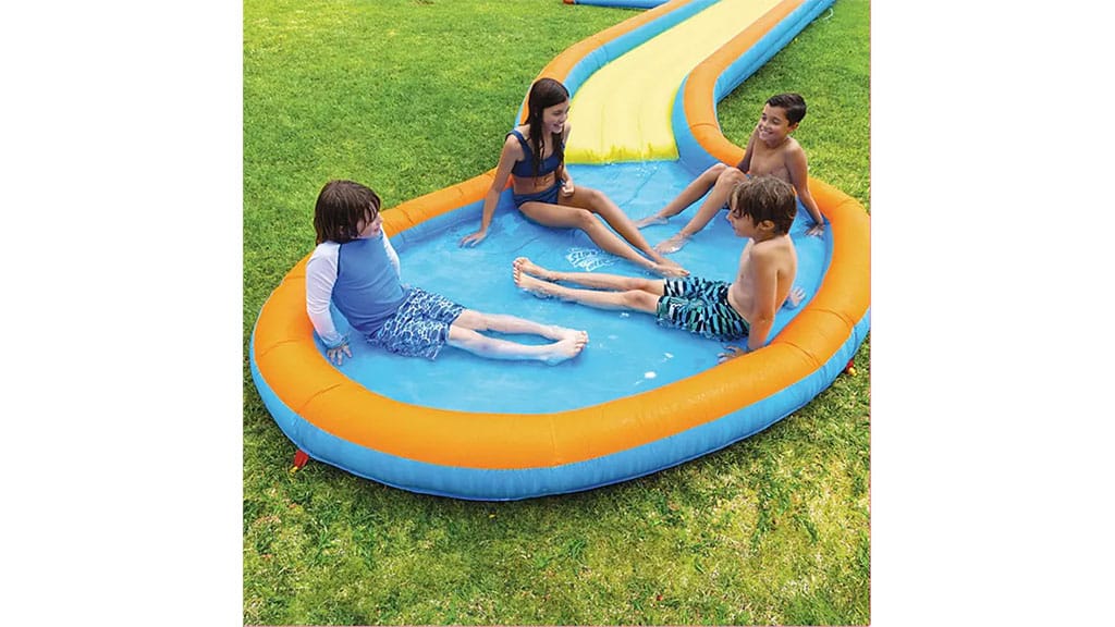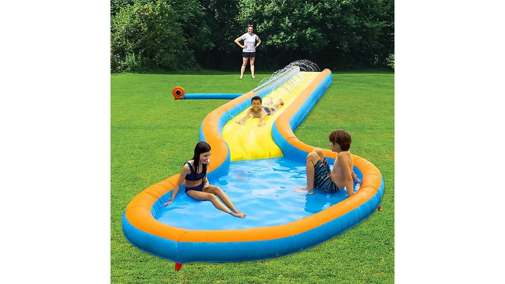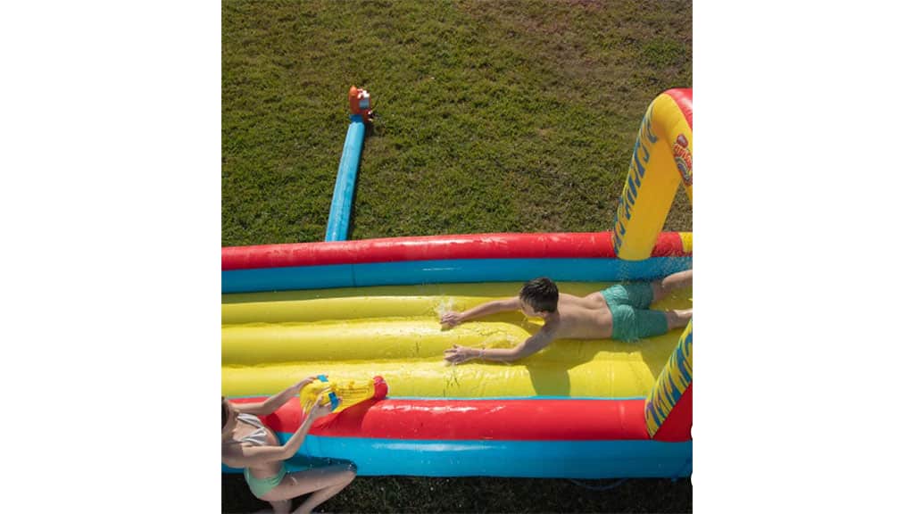 Ta 8,5 metra dolga Slip N Slide tobogan je popolna izbira, da se otroci ohladijo v poletni vročini, medtem ko so aktivni. Tobogan je opremljen z vodno brizgalko, ki neprestano škropi vodo, zato je igra še bolj razburljiva in spolzka. Paket vsebuje tudi napihovalno napravo, s katero je tobogan enostavno postaviti, ter na koncu bazen, kjer lahko otroci varno pristanejo in čofotajo. Ta tobogan zagotavlja ure in ure zabave ter sprostitve za vso družino v vročih poletnih dneh.