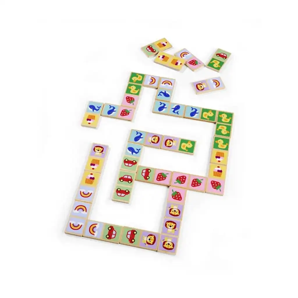 Ta domina ni le zabavna, temveč odlično razvija opazovalne sposobnosti, prepoznavanje barv in oblik ter spretnosti povezovanja. Otroci se učijo med igro: iščejo enake slike, jih povezujejo in lahko zgradijo dolge, pisane domine verige. Lesene domine so enostavne za prijem, trpežne, zato dobro zdržijo tudi bolj energično igro.