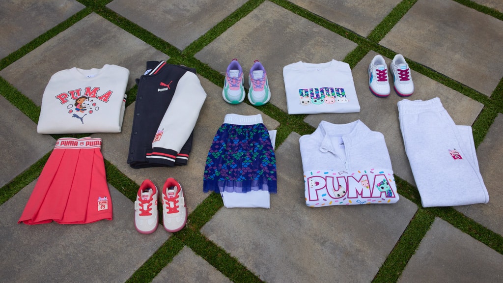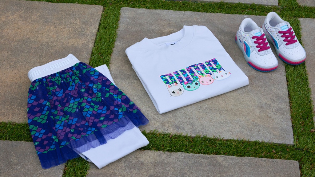 Za otroke, ki ne morejo izbrati najljubšega lika, PUMA poskrbi zanje (v mehkem, pulover materialu). Ena izmed PUMA x Gabi hišic za punčke 2-delni komplet vsebuje slike MerCat-a, njegovih prijateljev in vzorec, prekrit z luskami. Komplet vključuje krilo in pajkice, ki prikazujejo podoben vzorec lusk.