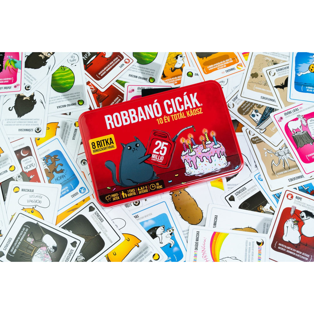 Robbanó cicák – 10-letna jubilejna izdaja družabne igre je izjemno smešna in hitra kartična igra, ki bo zagotovo v hipu postala družinska najljubša. Če iščeš hitro, enostavno za učenje, a vseeno taktično igro, ki je zabavna za vse starostne skupine, z njo ne moreš zgrešiti. Posebna jubilejna izdaja prihaja v elegantni kovinski škatli in vsebuje dodatne, redke bonusne karte, ki igro naredijo še bolj vznemirljivo in nepredvidljivo.