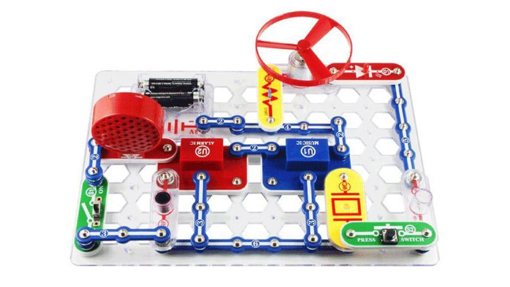 Komplet Snap Circuits 100 Explorer Kit vsebuje 28 barvno označenih delov, s katerimi lahko otroci sestavijo prave, delujoče električne tokokroge. S priloženimi navodili lahko preizkusijo več kot 100 različnih projektov, kot so glasovno upravljana stikala, glasbeni zvonci, leteči krožniki ali policijske sirene.