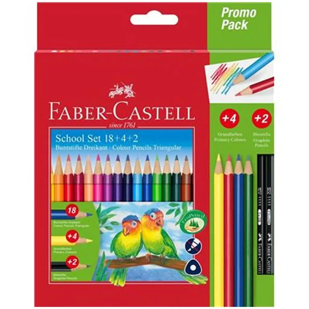 Faber-Castell Papagajev set barvic je popolna izbira, če iščete resnično bogat in navdihujoč nabor barv za svojega otroka. V 24-delnem setu je 18 osnovnih trikotnih barvic, dopolnjenih s 4 živahnimi osnovnimi barvami ter 2 grafitnima svinčnikoma – tako je vse, kar potrebujete za risanje, barvanje in šolske naloge, v enem paketu.