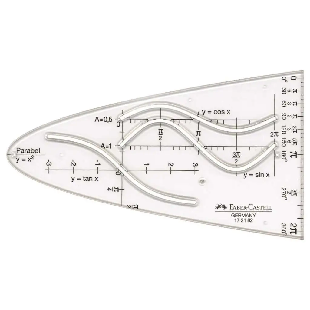 Faber-Castellov 14 cm parabolični šablon je odlično pripomoček za dijake, ki jih zanima matematika, predvsem za srednješolce in gimnazijce, ki se ukvarjajo z risanjem funkcij, trigonometričnimi krivuljami ali z urejanjem enačb. Ta šablon ni primeren le za parabelo (y = x²), ampak tudi za risanje številnih drugih pomembnih funkcij, kot so sinus (y = sin x), kosinus (y = cos x), tangens (y = tan x) in eksponentne oblike – natančno, lepo in pravilno.
