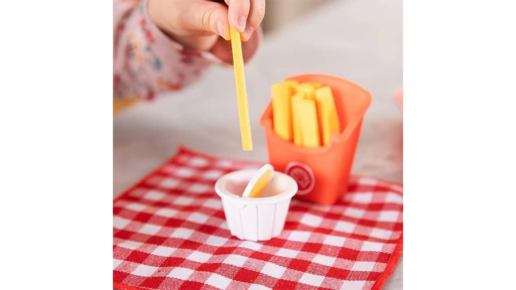 Otroci bodo navdušeni, ko bodo filc krompirček pomakali v omako, ki se izmenjuje med gorčico in kečapom s kompletom Pretendables Burger in Fries. Ta igra ni le zabavna, ampak tudi razvija otrokovo domišljijo in fine motorične spretnosti. Možnost menjave med različnimi omakami otrokom omogoča, da si predstavljajo različne okuse in teksture, medtem ko med igro kreativno oblikujejo svoj mali svet.