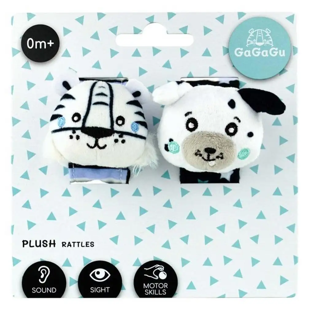 Ta komplet ropotulj za tigra in kužka je popolna izbira za najmlajše, da odkrijejo zvoke in oblike. Mehke plišaste ropotulje so udobno pritrjene na dojenčkovo zapestje, tako da so vedno na očeh in jih je enostavno premikati. Ropotulje z veselimi vzorci tigra in kužka bodo nasmejale dojenčka, medtem ko jih bodo zabavale z nežnimi ropotajočimi zvoki. Te interaktivne igrače ne razvijajo le sluha, ampak tudi spodbujajo vid s kontrastnimi vzorci ter razvijajo fine motorične spretnosti, ko jih dojenček prime in premika. Ropotulje so še posebej primerne za podporo razvoju dojenčkov že od rojstva. Lahki materiali in zasnova, ki omogoča pritrditev na zapestje, zagotavljajo, da so vedno pripravljene na igro, kamorkoli greste.