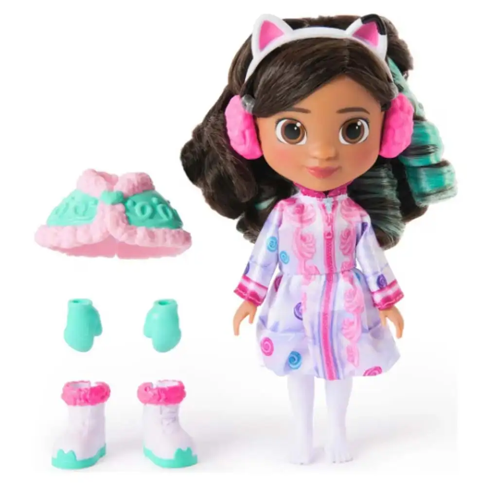 V pakiranju je več zamenljivih dodatkov, vključno z mentol-zelenim in rožnatim krilom, parom čevljev in majhnim zgornjim delom, tako da lahko otroci Gabby oblačijo po svojih željah in poustvarijo svojo zgodbo iz sveta sladkarij. Gabby ima gibljive okončine, tako da jo je enostavno postaviti v različne igralne situacije—pa naj bo to peka v kuhinji ali obisk dežele sladkarij.