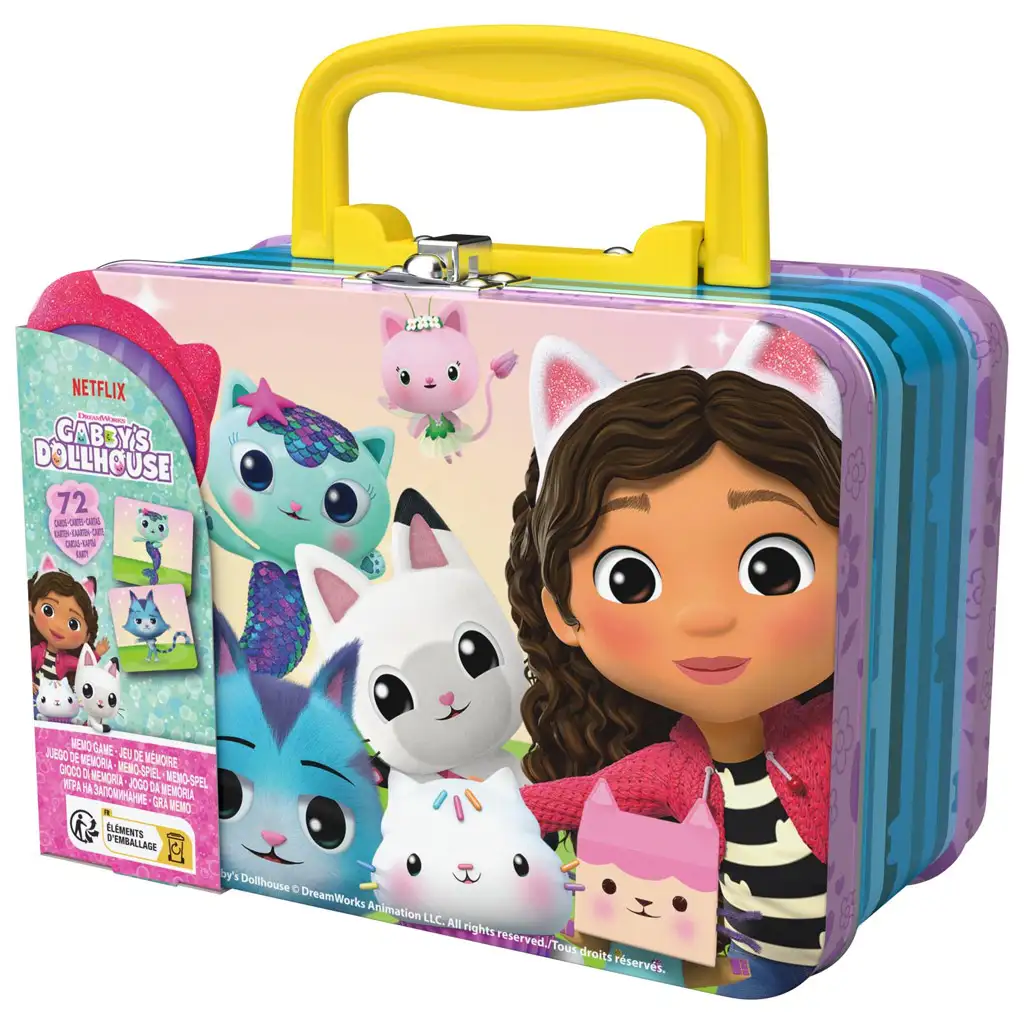Kartice so shranjene v praktičnem in lahko prenosljivem kovčku, katerega zasnova z zaponko zagotavlja, da bo igra vedno urejena in varna. Okrasitev kovčka zvesto odraža čarobni svet Gabine hiše za punčke, zato bodo otroci z veseljem znova in znova posegali po igri.