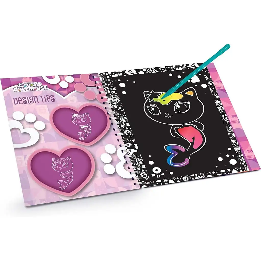 Gabino hiško za punčke A-meow-zing kreativni komplet za strganje je popolna izbira za vse malčke, ki radi rišejo in obožujejo čarobna presenečenja. Spiralna beležka s 44 stranmi vsebuje posebne strani s črno površino, pod katerimi se skrivajo bleščeči, mavrični ali zlat vzorci. S priloženim pisalom za praskanje lahko otroci enostavno ustvarijo prikupne like in prizore iz Gabine hiške za punčke. Vsaka stran kompleta je razburljivo odkritje – otroci lahko sprostijo svojo domišljijo, hkrati pa razvijajo fino motoriko in ustvarjalnost. V knjigi so vključene tudi šablone in okrasni elementi za še bolj unikatne izdelke. Popolna zabava za doma, na potovanjih ali kot darilo!