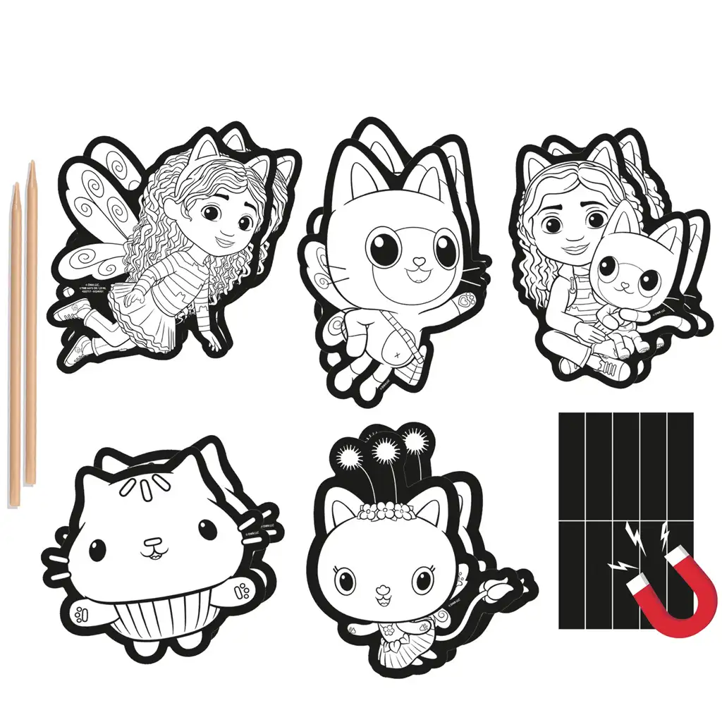 Komplet vsebuje 10 figur s črno površino za praskanje, pod katerimi se skrivajo barviti vzorci. Otroci lahko s priloženimi lesenimi palčkami za praskanje postopoma "odkrivajo" risbe in tako sami ustvarijo edinstvene okraske s svojimi najljubšimi liki. Med liki so seveda Gabi, Pandy Paws, Mačja deklica Muffin in še mnogo drugih ljubkih prebivalcev hiše za punčke.