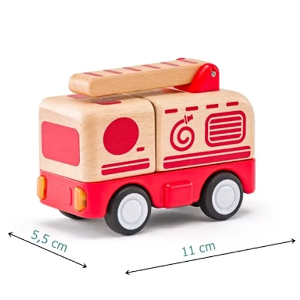 Ta leseni gasilski tovornjak je popolna izbira za majhne otroke, ki imajo radi gasilske dogodivščine! Izdelan je iz premium kakovostnega, okolju prijaznega lesa, zato je varen in trpežen za majhne roke. Zahvaljujoč zasnovi z vztrajnikom lahko otroci z lahkim potiskom zaženejo vozilo, kar zagotavlja razburljivo izkušnjo gibanja. Gasilski tovornjak je opremljen s svetlobnimi in zvočnimi učinki, kar igro naredi še bolj realistično in pomaga otrokom doživeti vzdušje prave gasilske akcije. Na vrhu se nahaja premična lestev, ki spodbuja otroke k nadaljnji ustvarjalni igri.