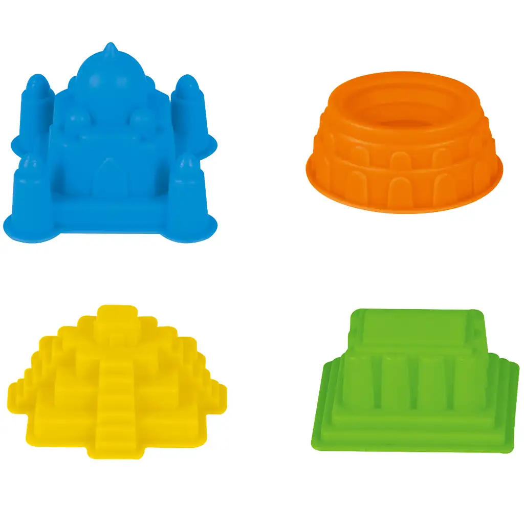 Set oblik za peskovnik v obliki gradov vsebuje štiri različne oblike za gradnjo peskovnikov, vsaka v drugačni barvi. Ti gradbeni elementi omogočajo otrokom, da zgradijo svoje male peskovnike v peskovniku.