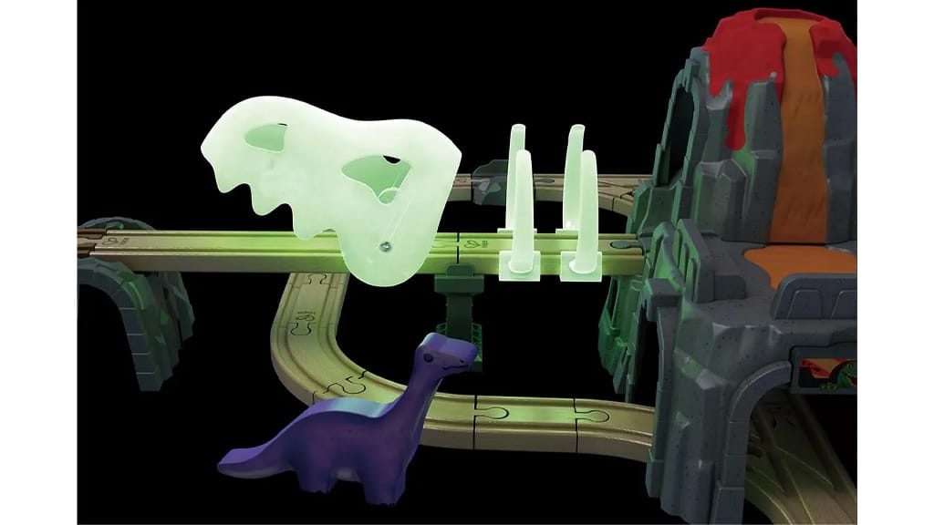 Hape Dino Pustolovščina Železniški komplet vsebuje 23 bukovih tirov, figure dinozavrov in vse potrebne dodatke za končno jursko potovanje z vlakom. Otroci lahko zgradijo veliko progo in vodijo leseni vlak skozi vulkan, dinozavrove kosti, dinozavrovo lobanjo in še veliko drugih ovir. Mali lahko postavijo dinozavre, žerjave, drevesa, kristale in še veliko drugih elementov okoli kompleta, da ustvarijo resnično privlačno izkušnjo. Ta igra ni le zabavna, ampak tudi razvija otrokovo ustvarjalnost in ročne spretnosti, medtem ko spoznavajo svet dinozavrov. Komplet omogoča otrokom, da si izmislijo lastne zgodbe in se potopijo v jurske pustolovščine, medtem ko kombinirajo in ponovno ustvarjajo progo z različnimi elementi. Med igro se otroci lahko naučijo tudi timskega dela, če skupaj gradijo progo in si delijo naloge. Ta železniški komplet je popolna izbira za vsakega malega raziskovalca, ki ima rad dinozavre in vlake.