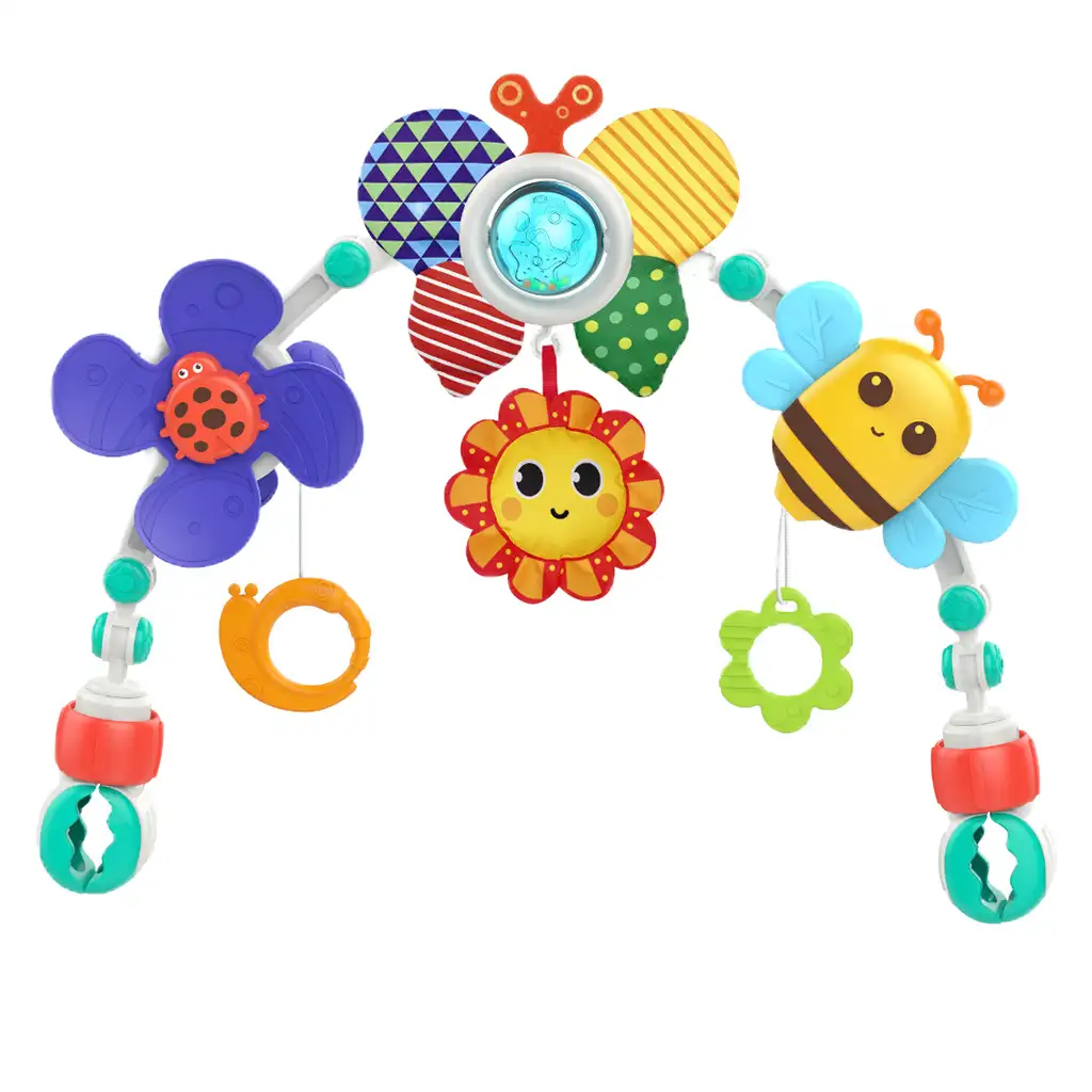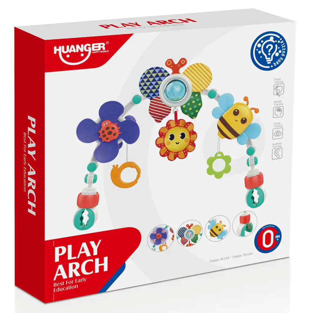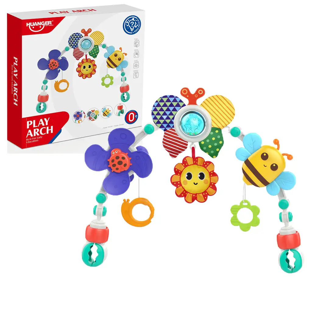 Na igralnem loku se nahajajo vesela čebelica, sonček, metulj in pikapolonica, ki odlično stimulirajo čute in radovednost dojenčkov. Ti igralni elementi imajo žive barve in različne teksture, ki pomagajo pri razvoju vida in tipa. Poleg tega elementi, ki visijo z igralnega loka, še dodatno pritegnejo otrokovo zanimanje in ga spodbujajo k igri.
