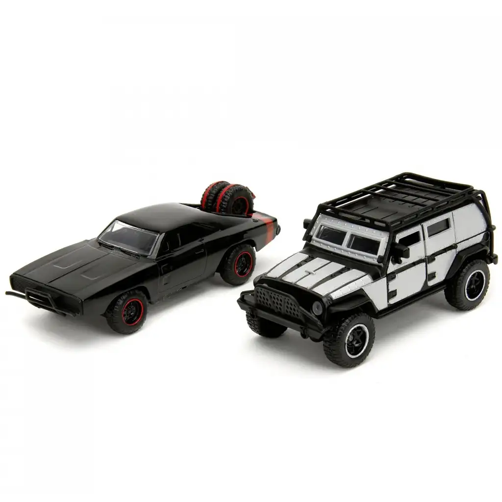 Pripravite se na pravo adrenalinsko bombo, saj je tukaj najnovejši favorit med oboževalci Hitrih in drznih! Kovinski modelni komplet Domovega Dodge Chargerja R/T in Tejevega Jeep Wranglerja ni le vpadljiv, ampak tudi vzdržljiv, zato bo zagotovo dolgo časa spodbujal domišljijsko igro malih dirkačev. Ti dve ikonični vozili zdaj prihajata v merilu 1/32, z bogatimi detajli in trpežno kovinsko karoserijo, ki prinašata svet filmov naravnost v otroško sobo.