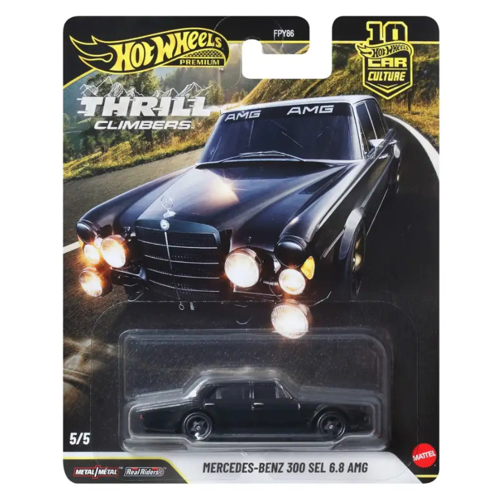 Model Mercedes‑Benz 300 SEL 6.8 AMG iz serije Hot Wheels Premium Cool-túra počasti legendarni dirkalnik „Red Pig“, ki je eden najbolj ikoničnih primerov v svetu turističnih dirk. Kot del serije Thrill Climbers ta model v merilu 1:64 pričara vzdušje gorskih serpentin in zahtevnih dirkališč.