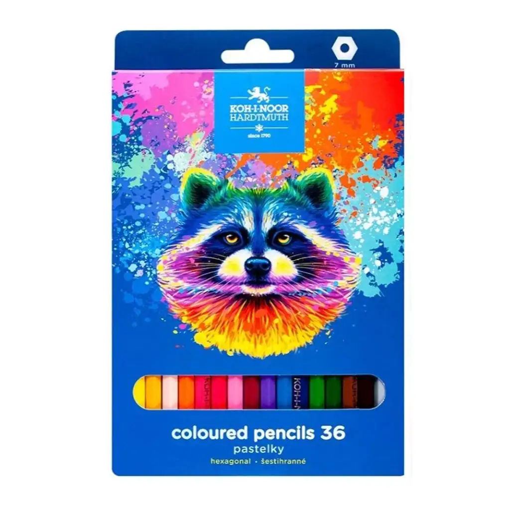 ICO: Koh-I-Noor 3555 Šestkotni barvni svinčnik v škatli z motivom rakuna, 36 kosov