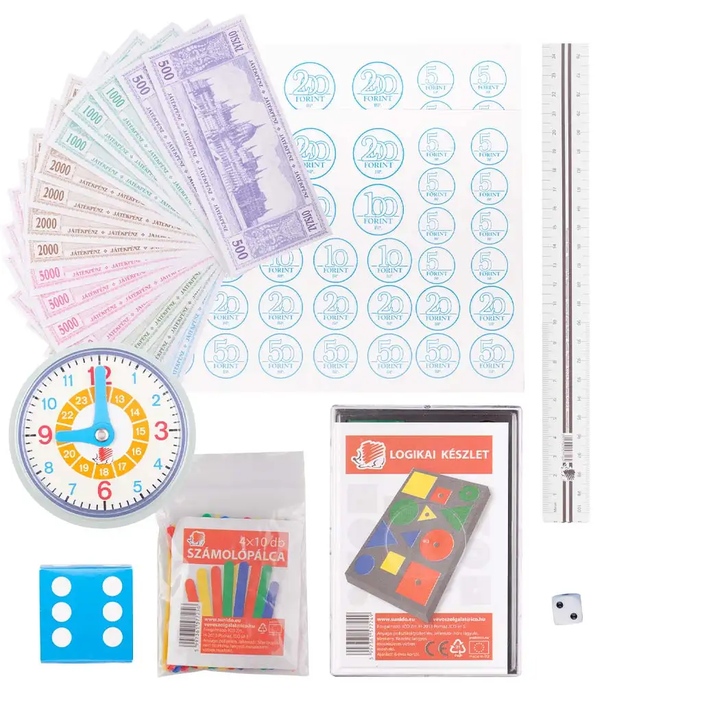 Komplet vsebuje barvasto, plastično šolsko uro, s katero se otroci skozi igro naučijo uporabljati analogno uro. Številske paličice in logični komplet pomagajo pri razvijanju računskih in razvrščevalnih spretnosti, kocke in igralni denar pa omogočajo zanimive, poučne igre. Spoznavanje ravnila se začne že v prvem razredu, zato tudi ta pripomoček ne manjka v paketu. Uporaba igralnega denarja in papirnatih kovancev je odličen način za razumevanje pojma denarja, njegove vrednosti in osnovnih izračunov.