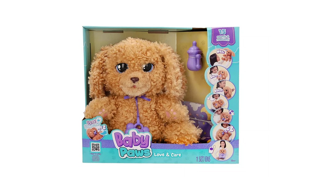 Ta igra uči spoštovanja, odgovornosti in skrbi prek realistične igre. Popolna je za otroke, ki si želijo psa, in za starše, ki ne marajo nereda! Igrača pes ima 15 različnih reakcij in zvokov: laja, cvili, rigne, srka, smrči in se zdi, kot da diha, ko se njegov trebuh premika gor in dol. Starši lahko prenesejo tudi aplikacijo Baby Paws in vnesejo podatke svojega otroka za simuliran obisk pri veterinarju. Malčki se lahko počutijo, kot da resnično vzpostavljajo stik z novim družinskim prijateljem, medtem ko ga božajo, opremljajo z dodatki in poslušajo!