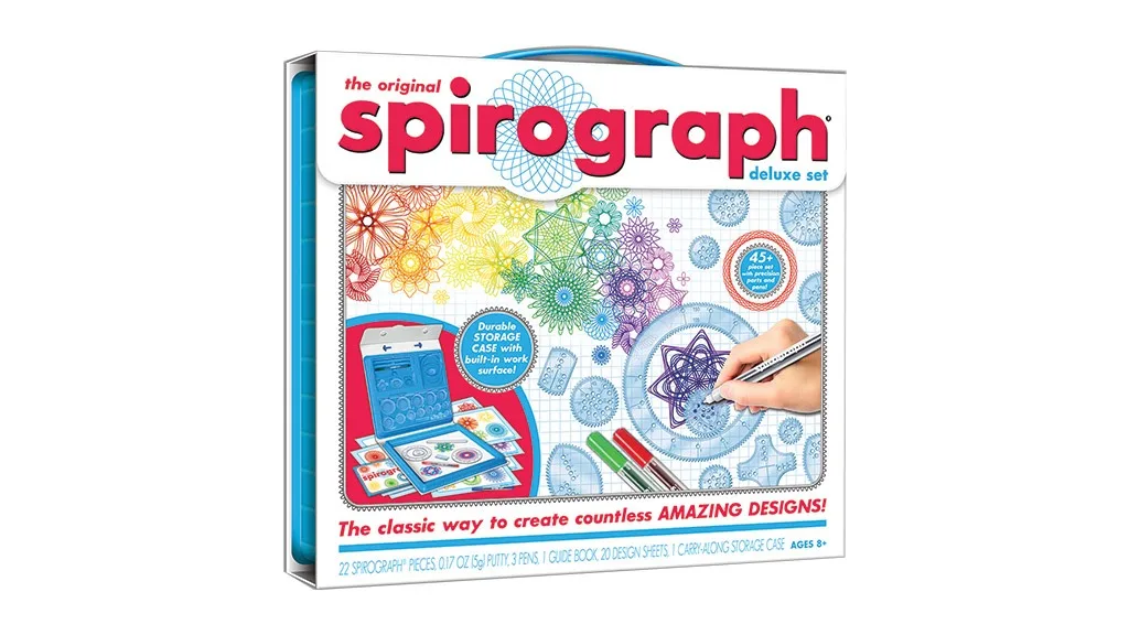 Klasična metoda za ustvarjanje nešteto dizajnov! Ta komplet je zvest originalu, a posodobljen za današnji čas. Vključuje prenosno torbico z vgrajenim shranjevanjem, Spirograph zobnike, oblikovalske peresa, priročnik, papir in še več.