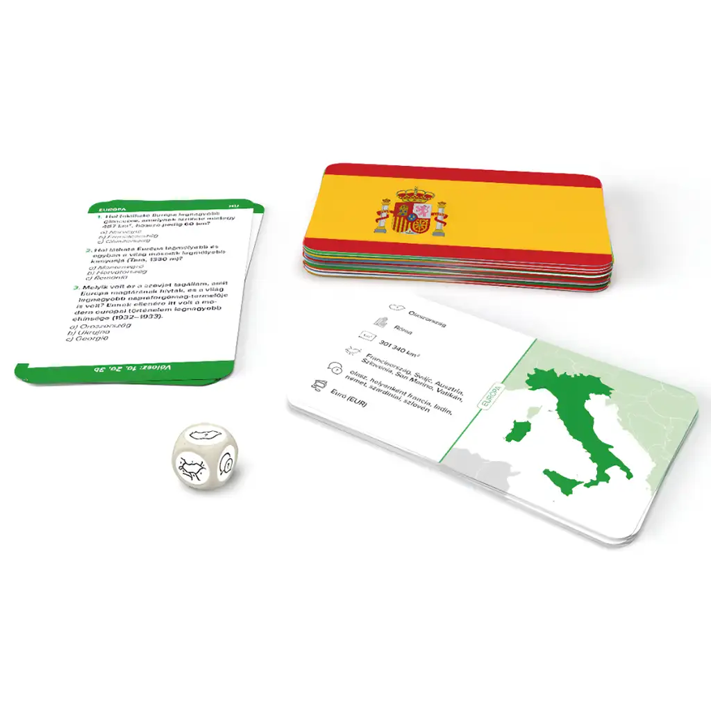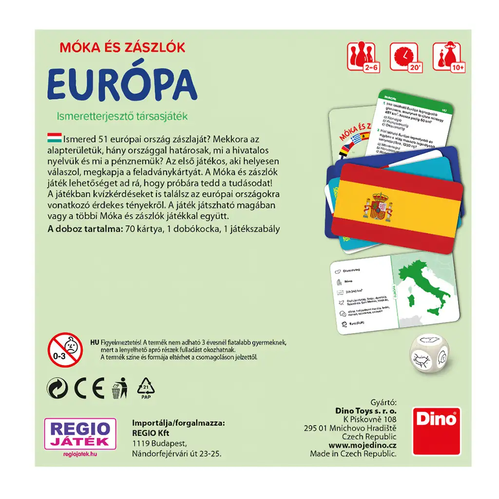 Móka in zastave - Evropska družabna igra je vznemirljiva in poučna izobraževalna igra, ki pomaga odkrivati evropske države, njihove zastave in zanimiva dejstva o posameznih narodih. Med igro lahko udeleženci podrobneje spoznajo 51 evropskih držav, vključno z njihovimi zastavami, površino, sosednjimi državami, uradnim jezikom in valuto. Cilj igre je pravilno odgovoriti na čim več kviz vprašanj in pridobiti ugankarske kartice, ki razkrivajo nove zanimivosti o državah.