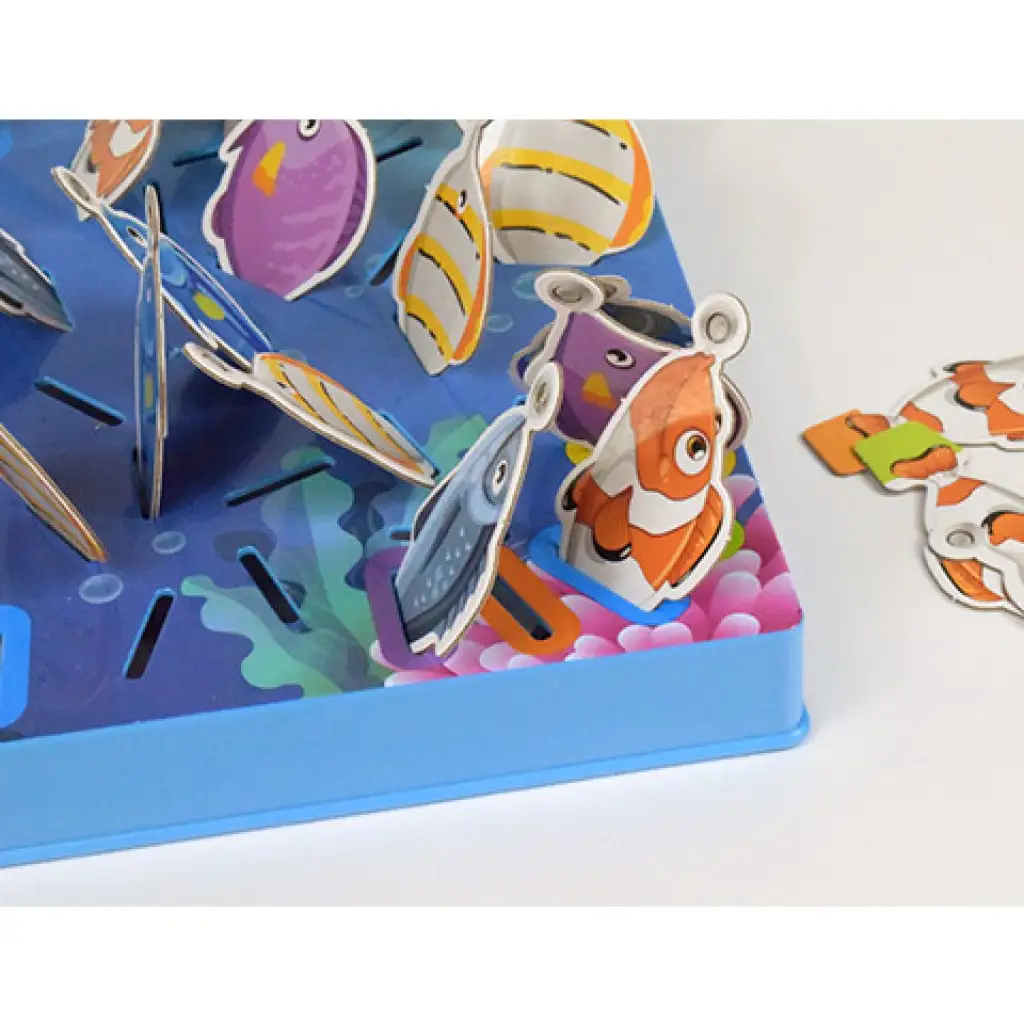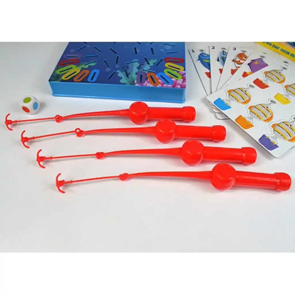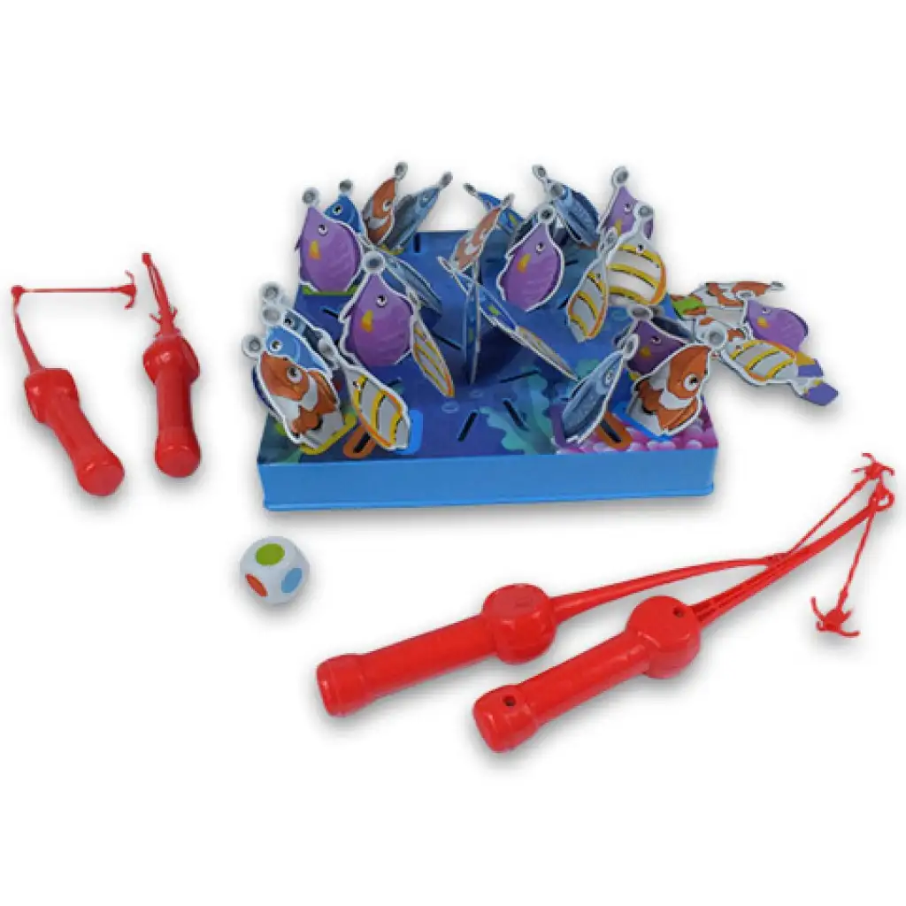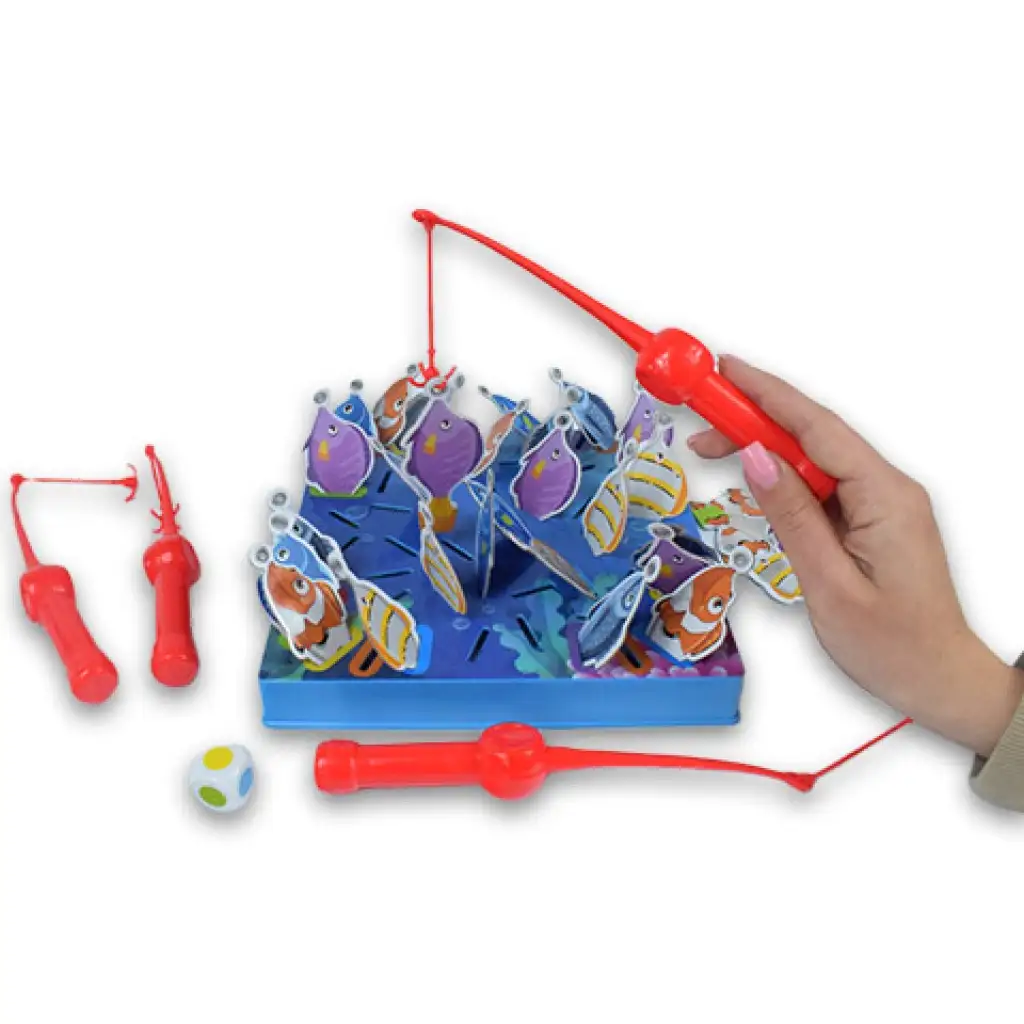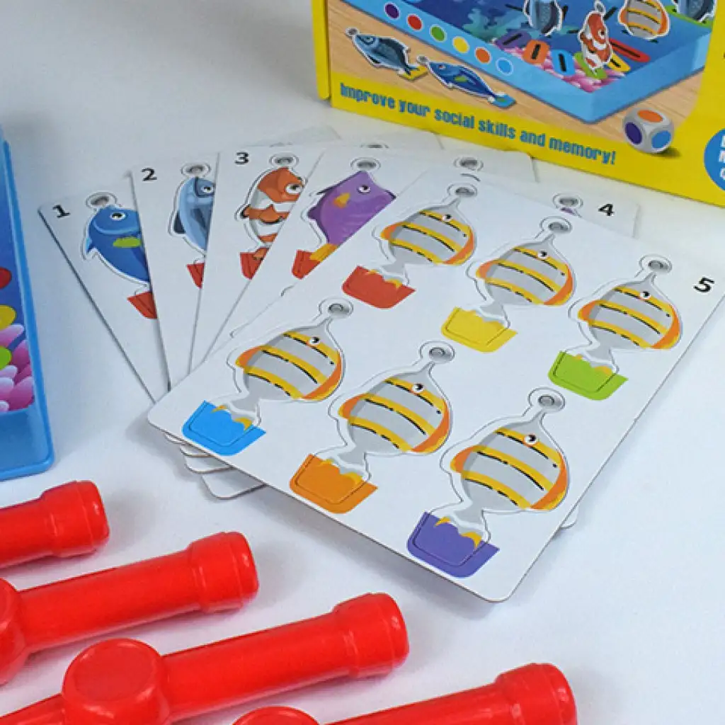 Prinesli smo super družabno igro, ki jo bo uživala cela družina, saj je zabavna, a vseeno bo potrebna tudi dobra memorija. Igra je sestavljena iz igralne plošče velikosti 20x20 cm, rib, ribiških palic in kocke. Bistvo igre je, da ima vsaka riba na dnu eno barvo, ki se, ko je postavljena na ploščo, ne vidi več - razen rib v štirih vogalih - naloga pa je, da z ribiško palico ulovite ribo barve, ki jo pokaže kocka. Če se zmotite v barvi, je na vrsti naslednji igralec, na koncu pa zmaga tisti, ki ulovi največ rib. Igra torej ni le zabavna, ampak tudi krepi možgane in zahteva spretnost. Pridobite jo in igra se lahko začne.