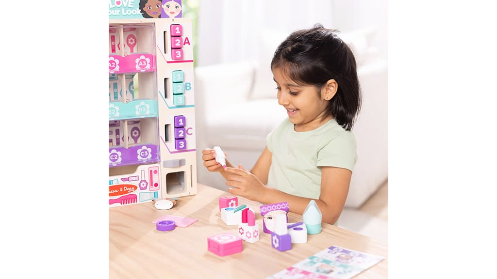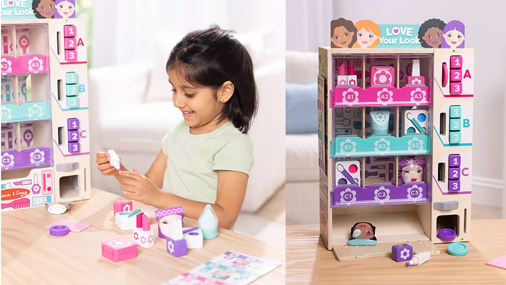 Melissa & Doug zdaj popolnoma prenavlja priljubljeni komplet igrač Vending Machine! Ta komplet, ki posnema prodajni avtomat, je bil že doslej najljubši mnogim otrokom, zdaj pa se vrača v še bolj vznemirljivi, barvitejši in podrobnejši izvedbi. Zahvaljujoč izboljšavam bodo otroci deležni še bolj pristne izkušnje, medtem ko se bodo skozi igro učili o uporabi denarja, nakupovanju in vsakdanjih življenjskih situacijah. Cilj podjetja Melissa & Doug je, da veselje do ustvarjalne igre pripelje v vsako družino, in nova različica kompleta Vending Machine je za to popolna izbira!Uredi, napolni in izberi! Komplet igre Beauty Kiosk združuje domišljijsko igro s pomembnimi razvojnimi veščinami, kot so ujemanje, štetje in prepoznavanje črk. Novi avtomat ne izdaja prigrizkov, temveč lesene izdelke za nego lepote, ki jih lahko otroci razvrstijo in postavijo na polico. Od preverjanja zaloge do ustvarjanja domišljijskih ličil se razvijata otrokova samozavest in miselne sposobnosti, medtem ko lahko pokažejo svoj notranji sijaj. Ta igra ni le zabavna, ampak pomaga tudi pri razvoju socialnih veščin in fine motorike, medtem ko se otroci učijo in ustvarjajo v igri vlog.