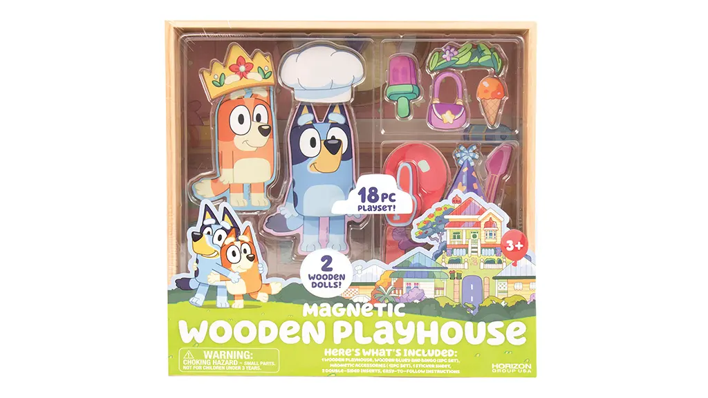 Ta 18-delni igrača vsebuje magnetno figuro iz lesa Bluey in Bingo, 12 magnetnih dodatkov, premične nalepke in ponovno uporabljivo tablo z dvema stranema igralnega polja.