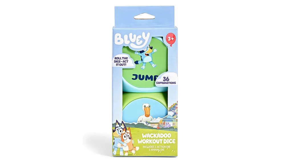 Vnesi nekaj domišljijske zabave v igralno noč s tem kockastim kompletom na temo Bluey. Otroci najprej z eno kocko izberejo žival, z drugo pa dejanje. Skupaj obstaja 36 edinstvenih kombinacij, kot je plesati kot pelikan ali skakati kot hobotnica.