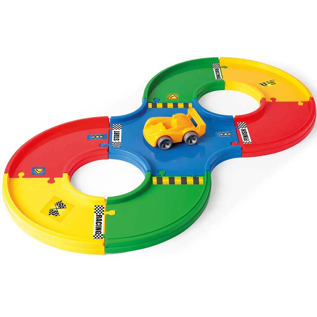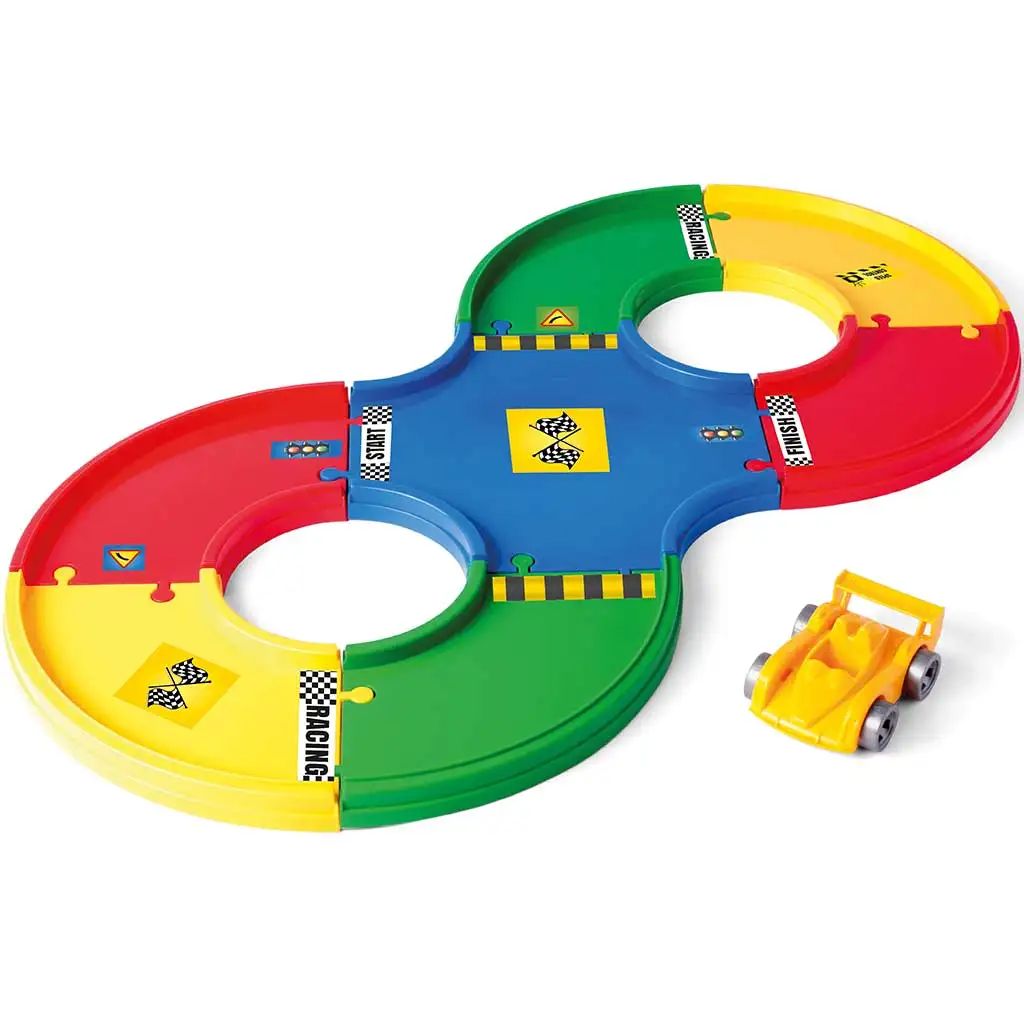 Wader Play Tracks Osnovni komplet dirkalnih prog je narejen za ljubitelje hitrosti! Ta komplet vsebuje vse, kar potrebujete za razburljivo avtomobilsko dirko: 1,6 metra dolga proga, dirkalni avto in 36 nalepk za popolno prilagoditev. Enostavno sestavljivi deli proge zagotavljajo, da so mladi dirkači pripravljeni na prvo veliko dirko v nekaj minutah. Različne barve in oznake na avtomobilski progi ne samo da so vizualno privlačne, ampak tudi neprestano pritegnejo pozornost otrok, medtem ko razvijajo spretnost in koordinacijske sposobnosti. Z nalepkami lahko vsakomur dajo edinstven videz dirkalne proge in avtomobila.
