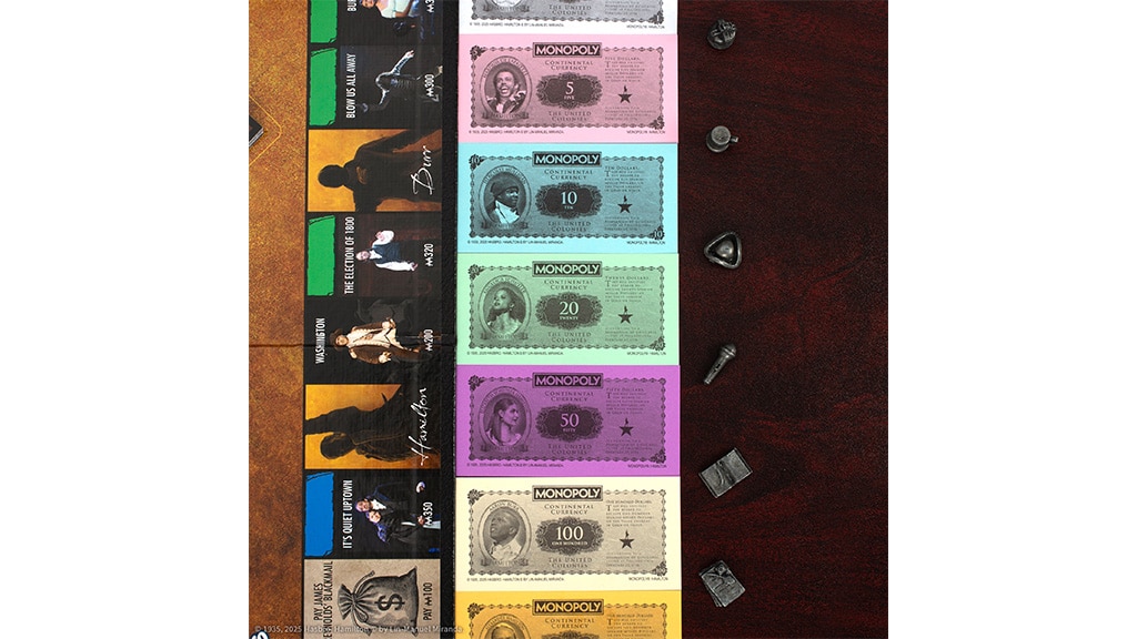 Ob znanih figuric ta družabna igra vsebuje tudi dodatne elemente, ki jih je navdihnil broadwayski muzikal. Hiše in hotele so tukaj zamenjala Pisma in Federalistični spisi, medtem ko so mesto kart Skupnostna skrinja in Priložnost prevzele karte Burr in Hamilton. Kovanci in bankovci v igri prikazujejo like, kot so Angelica Schuyler, Hercules Mulligan, markiz de Lafayette in Alexander Hamilton. Ta posebna izdaja ponuja razburljivo izkušnjo ne le ljubiteljem muzikala, temveč tudi ljubiteljem družabnih iger, saj klasično igranje združuje z edinstvenim zgodovinskim vzdušjem.