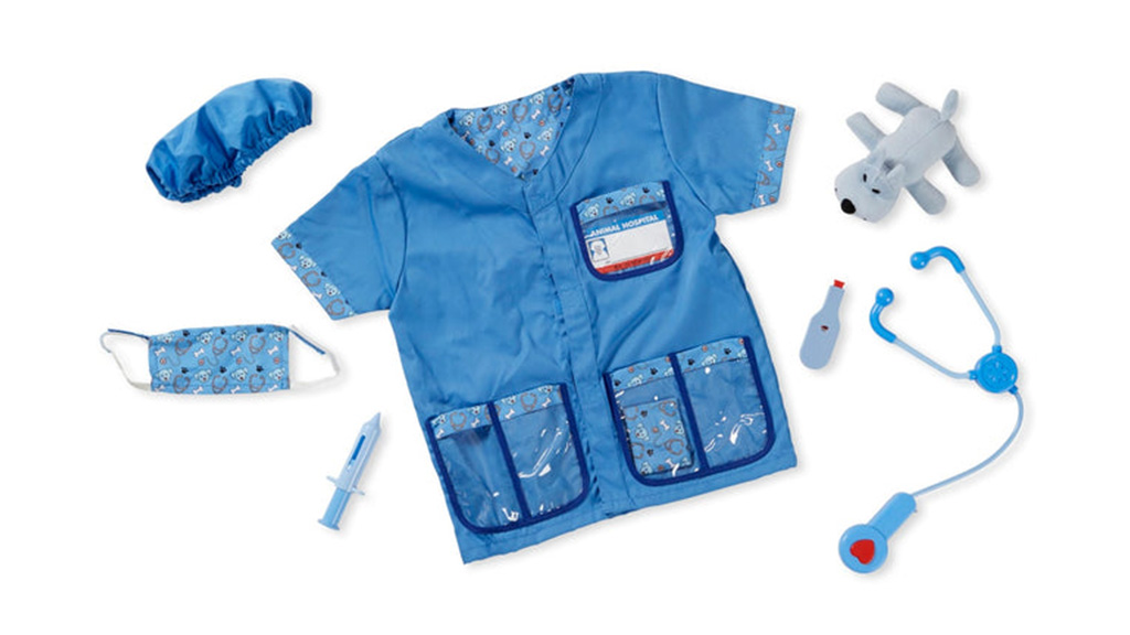 Med igro z namišljenimi igrami lahko malčki skrbijo za svoje namišljene hišne ljubljenčke in plišaste živali. Komplet vsebuje plašč, masko, kapo, termometer, stetoskop z zvočnimi učinki, povoj, injekcijo, plišastega psa in ponovno uporabno tablico z imenom. Poleg tega se otroci lahko naučijo uporabljati veterinarska orodja ter razvijajo svoje socialne veščine in empatijo med igro.