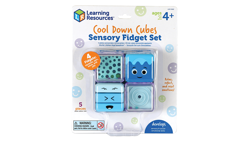 Ta štiri pomirjujoče senzorične kocke ponujajo različne fidget aktivnosti, ki pomagajo otrokom pri obvladovanju njihovih čustev. Otroci lahko stisnejo počasi vračajočo se peno, vrtijo vrtavko, rešujejo labirint in pretresajo padajoče kroglice. Kocke se lahko shranijo v pladnju, ko se čas igre konča.