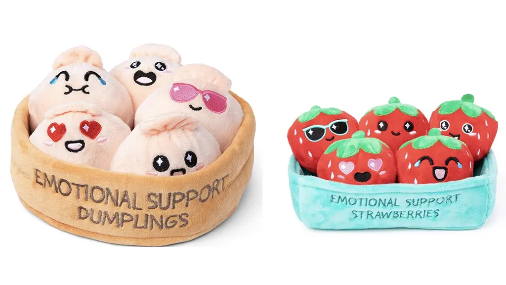 Vsem priljubljena tolažilna hrana, zdaj v obliki pliša! Ti očarljivi plišasti izdelki hrane izgledajo točno kot pravi. So mehki, smešni in preprosto ljubki. Od sreče in žalosti do smeha in jeze, Emotional Support plišasti izdelki so zdaj na voljo v obliki Chicken Nugget, Knedl in Jagoda.