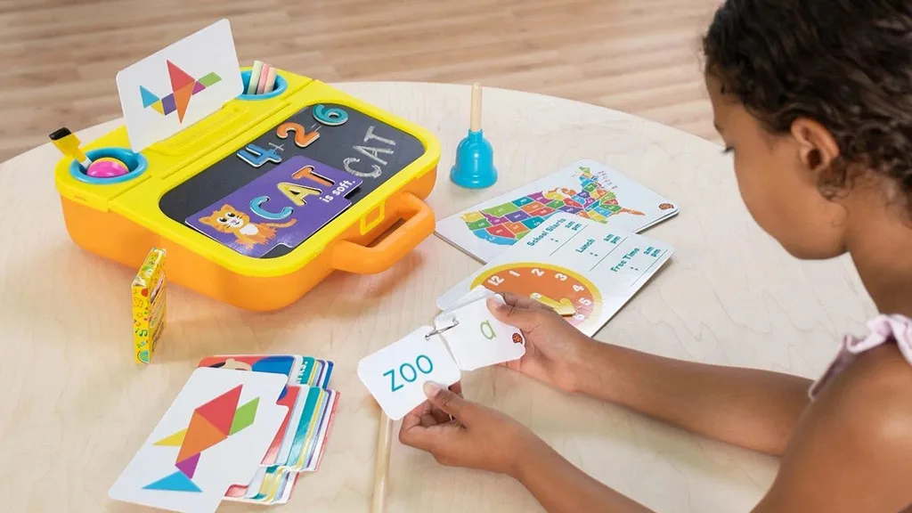 Prenosna šolska miza ima na zunanji strani magnetno tablo, dva vgrajena držala za orodje in stojalo za učne kartice. Otroci jo odprejo in znotraj najdejo magnetno belo tablo, dva pokrita prostora za shranjevanje ter veliko pripomočkov, vključno s kredo, magnetnimi črkami in številkami, magnetnimi tangram oblikami, besednimi karticami, matematičnimi karticami in še veliko več.