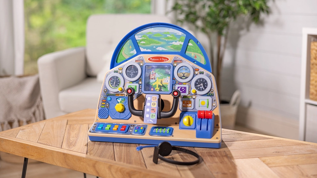 Prihodnji piloti se lahko pripravijo na vzlet s to interaktivno nadzorno ploščo, ki vključuje luči, gumbe, predvajanje zvoka, štiristopenjsko ročico za plin in še veliko več. Otroci lahko zavrtijo volan, da premaknejo mini letalo na drsnem zaslonu.