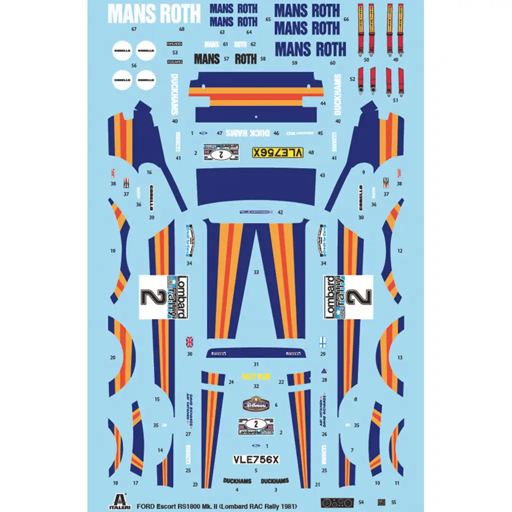 Ta Italeri model v merilu 1:24 natančno prikazuje podrobnosti rally različice Ford Escort RS1800 Mk.II. Komplet vključuje natančno izdelano pokrov motorja, ikonične rally žaromete in podrobno notranjost. Priložen komplet nalepk omogoča realistično predstavitev originalnih dekoracij, ki spominjajo na dizajn slavnega Lombard RAC Rally. Natančno prilegajoči se deli in pnevmatike naredijo model še bolj realističen, kar je popolna izbira za ljubitelje klasičnih rally avtomobilov.