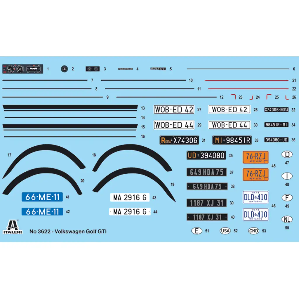 Ta visokokakovostni Italeri model v merilu 1:24 natančno prikazuje podrobnosti prve generacije VW Golf GTI. Model je dolg 15,2 cm in ima skrbno izdelano karoserijo, notranjost in vzmetenje. Komplet vključuje pnevmatike in fino izdelane plastične dele, ki zagotavljajo realističen videz. Natančna zasnova modela omogoča, da ga zlahka sestavijo tako začetniki kot tudi napredni modelarji.