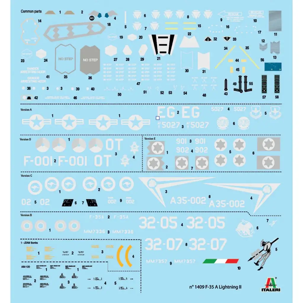 Model F-35A Lightning II v merilu 1:72 podjetja Italeri odlično prikazuje oblike in podrobnosti pravega letala. V kompletu so trup, krila in oborožitev oblikovani z veliko pozornostjo do najmanjših podrobnosti, da model ponuja realističen videz. Komplet vsebuje tudi podrobne nalepke, s katerimi je mogoče prikazati oznake zračnih sil različnih držav. Natančno prileganje delov olajša sestavljanje, zato je odlična izbira tako za začetnike kot za napredne modelarje.