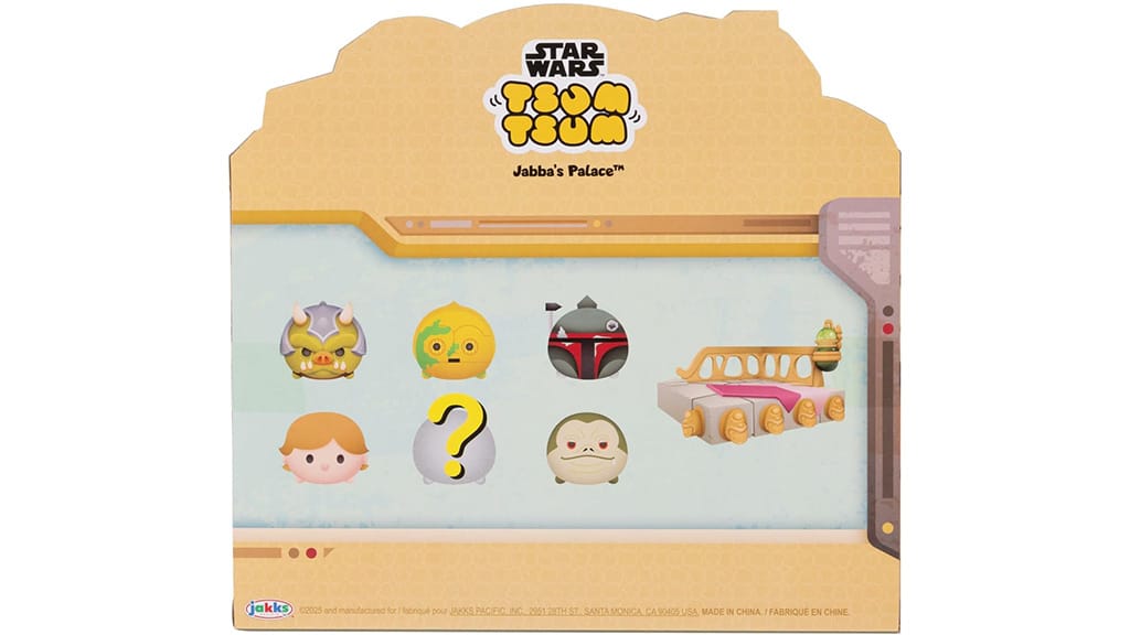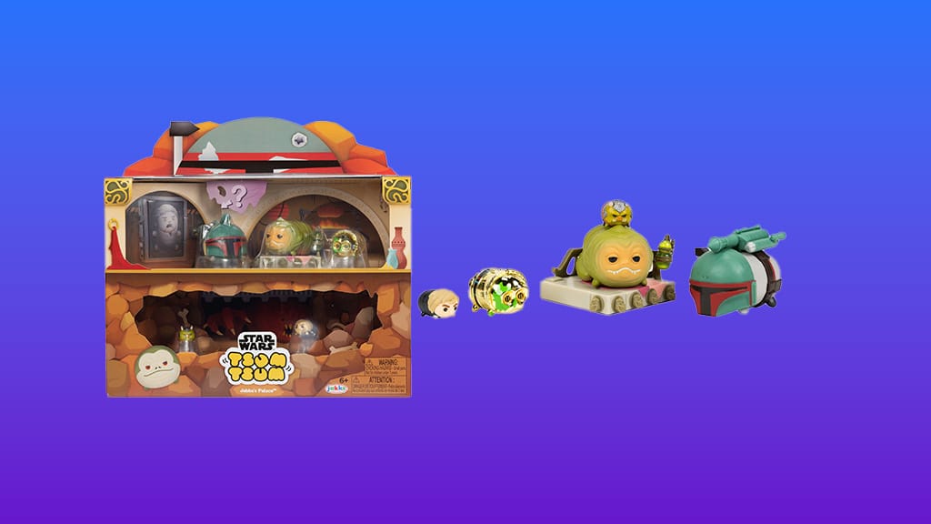 JAKKS Pacific Star Wars Tsum Tsum Jabba Palača Deluxe Set je zasnovan za mlade, medgalaktične otroke, ki obožujejo franšizo. Te majhne figure so navdihnjene s filmom Vojna zvezd: Vrnitev Jedija, vključno s ključnim trenutkom, ko se Luke Skywalker bori z Jabbo, Huttom. Majhne, a močne, figure v kompletu vključujejo velikega Boba Fetta (3,8 cm), velikega Jabbo, Hutta, srednjega C-3PO (2,5 cm), malega Gartogga (1,3 cm), malega Lukea Skywalkerja in presenečenje lik. Set vključuje tudi velik dodatek, prestol Jabbe, Hutta. Škatla za igro služi tudi kot zbirateljska vitrina.