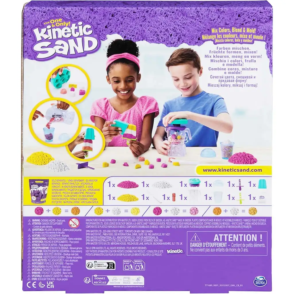 Kinetic Sand: Smoothie mešalnik s 396 g peskene mase prinaša pravo ustvarjalno doživetje v otroško sobo, kjer se igra in domišljija srečata. S tem posebnim kompletom lahko tvoj otrok ustvari lastne "peščene smoothije" in pisane sladolede, skoraj tako, kot bi ustvarjal v pravi kuhinji – le da brez nereda in lepljivosti. Legendarni Kinetic Sand je svilnato mehak na otip, enostavno se oblikuje, ne izsuši se in se lepi izključno nase, zato je igra čista in varna.