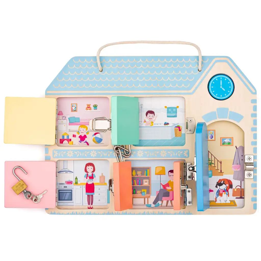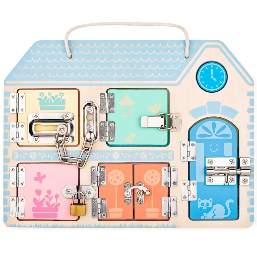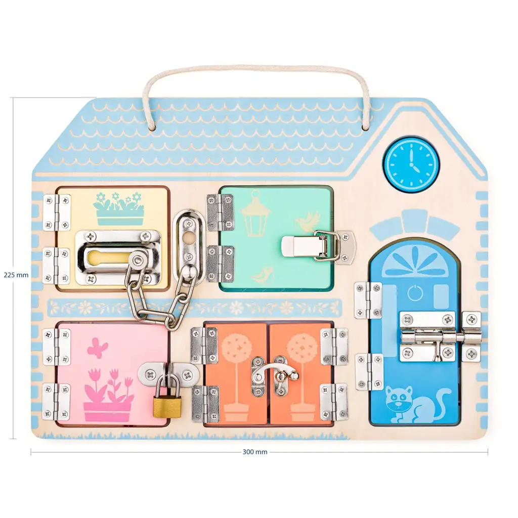 Tabla v obliki hišice vsebuje vrata različnih velikosti in barv, vsaka z drugačno vrsto ključavnice ali zapiralnim mehanizmom. Malčki lahko preizkusijo ključavnico s ključem, verižni zapah, drsno ključavnico in druge mehanizme, medtem ko skozi igro razvijajo ročne spretnosti in logično razmišljanje. Za vsakimi vrati se skriva prijazna ilustracija domačega prizora, kar naredi raziskovanje še bolj vznemirljivo.