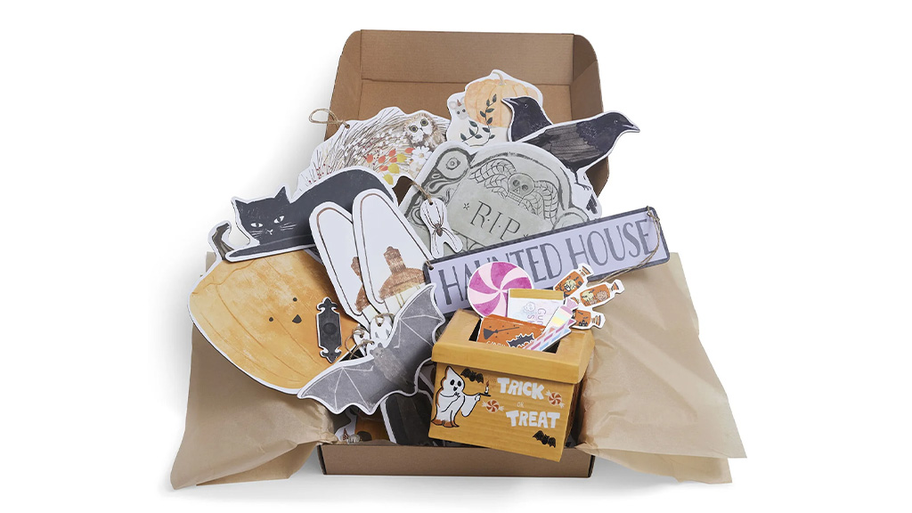 Make It Spooky – Halloween dekoracijski komplet vsebuje ročno ilustrirane dekorativne elemente, izdelane iz trajnostnega kartona in papirja. Komplet vsebuje venec, tri sete buč, zvonec, škatlo za trike ali darila s petimi igračami bonbonov, dve svetilki, dvostransko tablo hiše duhov (z edinstveno zadnjo stranjo), nagrobnik, tri vrane, črno mačko, tri netopirje in pajka.