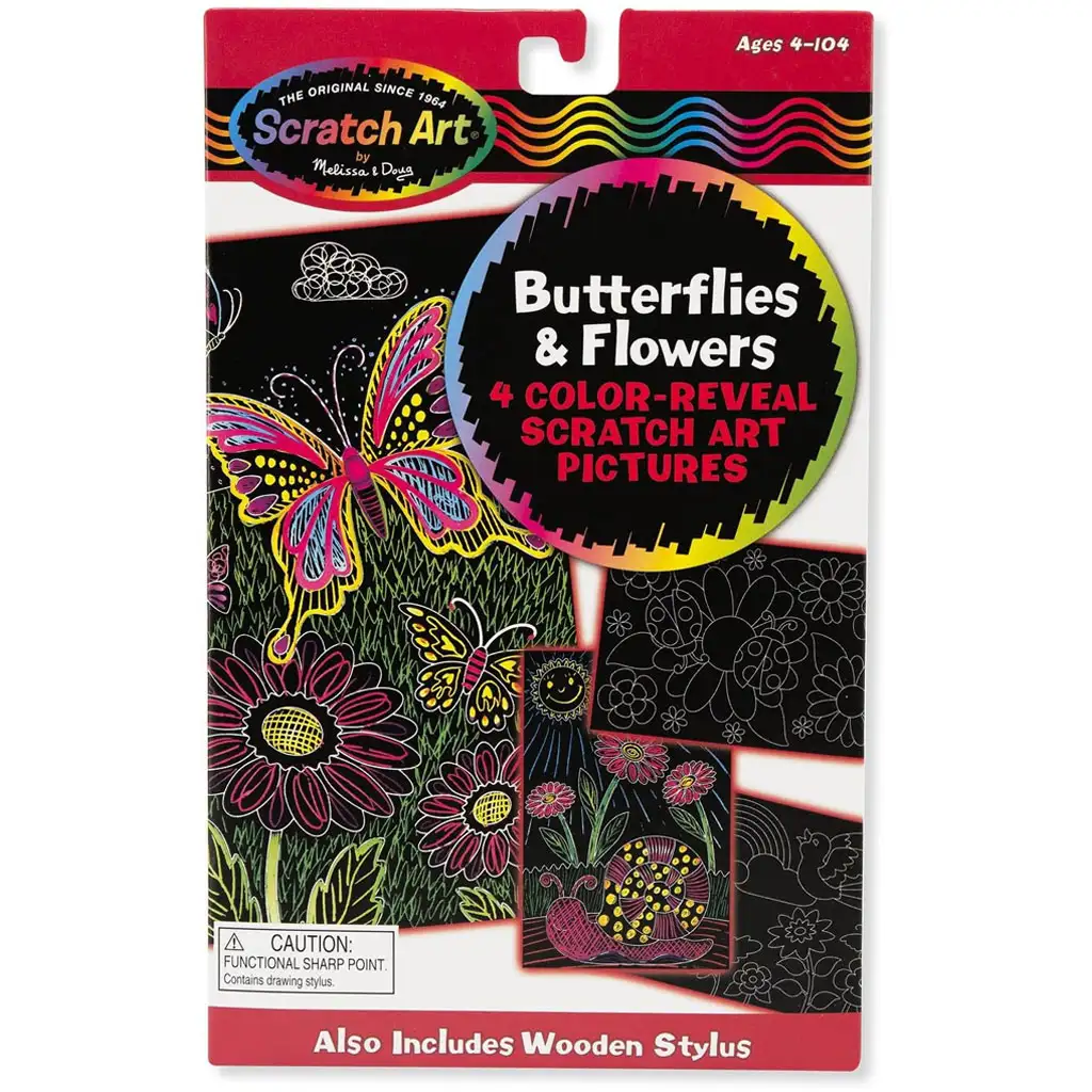**Melissa & Doug Set za ustvarjanje praskank z metulji in cvetlicami** je popolna izbira, če želite svojega otroka zaposliti s kreativno, zabavno in hkrati razvijajočo dejavnostjo. Ta set je idealen za vse otroke, starejše od 4 let, ki obožujejo ustvarjanje in čarobni svet barv. S pomočjo tega seta lahko otroci enostavno ustvarijo čudovite slike z metulji in cvetlicami, vse to s posebno tehniko: črno plast, ki prekriva barvno podlago, lahko postrgajo s pomočjo lesene palčke, in tako se razkrijejo čudovite barve.