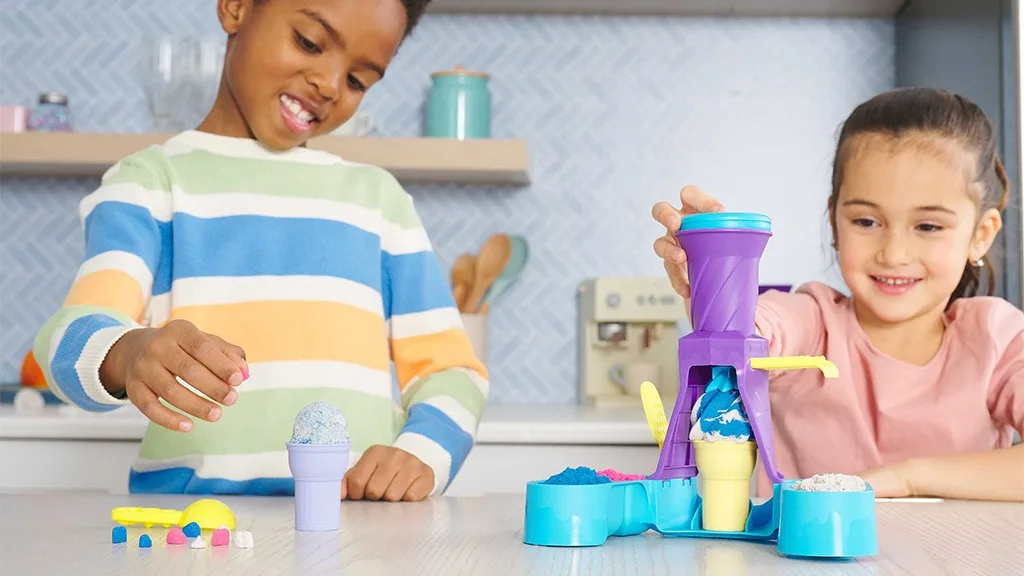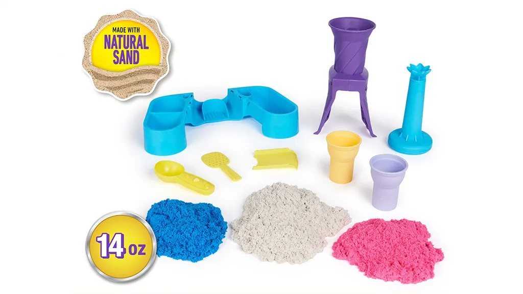 Preprost in enostaven za uporabo komplet igrač vključuje dozirnik, s katerim lahko otroci ustvarijo tisti značilni mehki sladoled v zavitem obliki. Komplet vsebuje tudi sladoledno žlico, plastične stožce in kinetični pesek v treh barvah: roza, modra in nežna bela.In seveda, užitek ob sladoledu ni popoln brez nekaj zaključnih potez. Otroci lahko uporabijo oblike na ročaju sladoledne žlice, da odtisnejo majhne čipske iz peska, ali pa pesek potisnejo skozi cedilo, da dodajo konfeti podoben pridih.