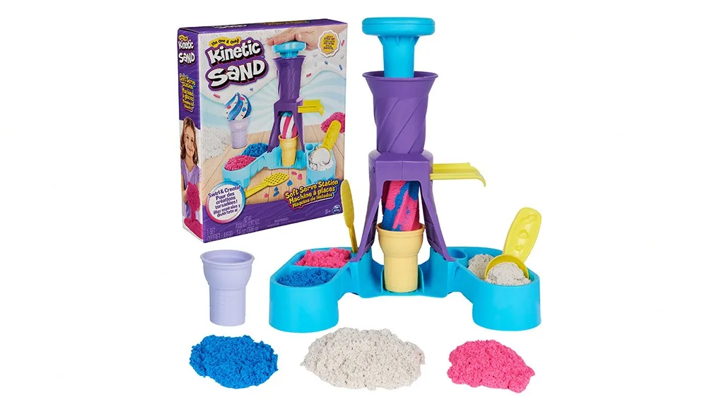 Igranje s peskom še nikoli ni bilo tako sladko. Z igralnim kompletom Spin Master Kinetic Sand Soft Serve Station lahko otroci sprostijo svojega notranjega prodajalca sladoleda in postrežejo peskaste dobrote, brez obiska plaže.