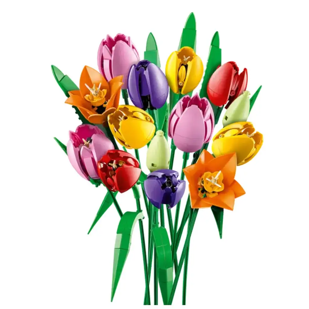 • 5 LEGO® TULIPANOV – Šopek vsebuje 5 tulipanov v različnih barvah in stopnjah cvetenja: zelene popke, zaprte vijolične tulipane ter razprte rdeče, rumene in roza tulipane.