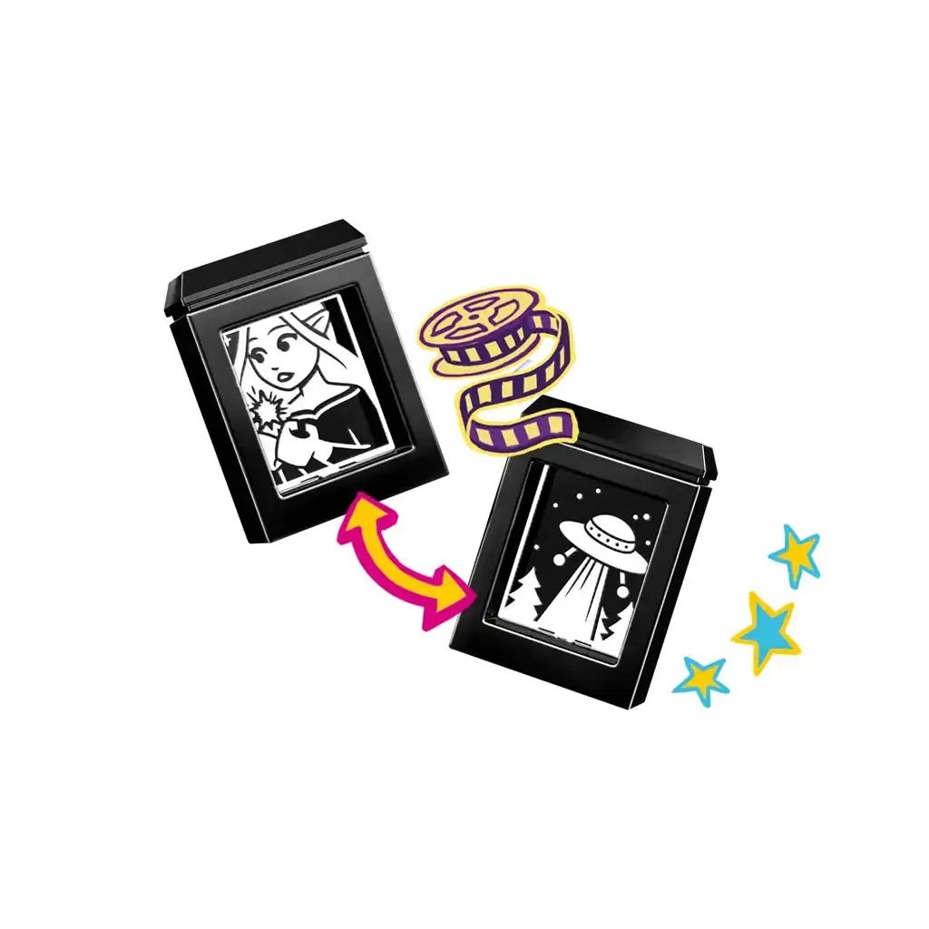 Luč, kamera, prijateljstvo! – in že se lahko začne pripovedovanje zgodbe o prijateljicah Paisley in Aliyi, ki v Paisleyjevem vrtu prirejata zabaven filmski večer. Vstavi diapozitiv v projektor in pritisni na osvetljeni element, da se slika pojavi na filmskem platnu. Odkrij številne dodatke, kot je aparat za pokovko, ki s pomočjo ročice „pripravi“ pokovko! Med dodatki so tudi škatla za pokovko, strip in 2 udobna vrečasta stola.